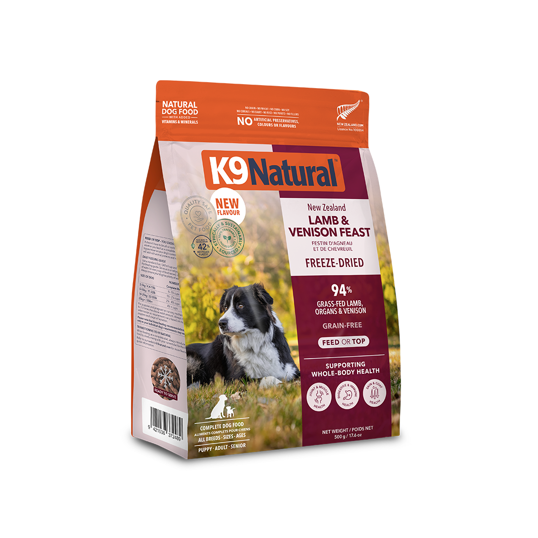 Our Freeze-Dried New Zealand Lamb & Venison Feast is packed with New Zealand wholefood goodness, providing a natural diet with added vitamins and minerals. Rich in protein, nutrients, and energy for a happy, healthy dog.