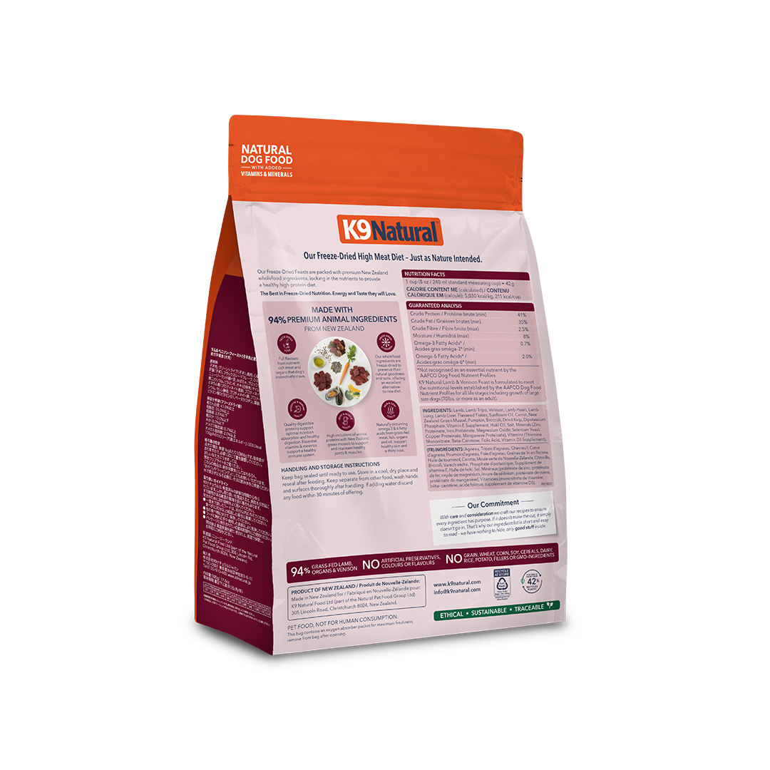 Our complete and balanced Freeze-Dried New Zealand Lamb & Venison Feast contains 94% Grass-fed & Grass-finished Lamb, Venison & Organs, with New Zealand Green Mussels, Flaxseed Flakes, Vegetables, Oils, Kelp, Vitamins, and Minerals in support of your dog's whole-body health.